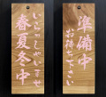 ダイナミックな木目の欅材を使った営業中・準備中を示す看板です。お店の入口に吊り下げてお使いください。